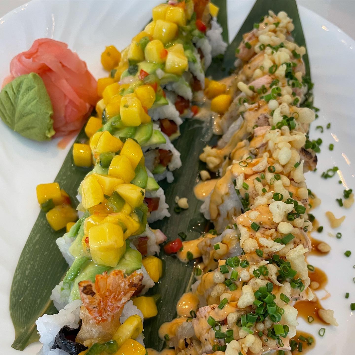HARBOUR SUNSET ROLL: Tuna, spicy tuna, scallions, jicama topped with